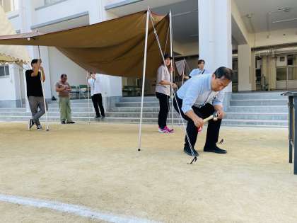 教職員で運動場の整地やライン引き、会場設営、掲示物や禁止テープの掲示など