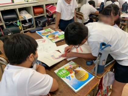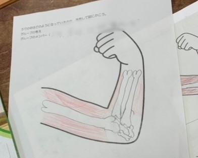 ヒトのうでのつくりについて考えました。「骨と筋肉はどのようになっているのだろう?」「筋肉は骨のまわりにあるのかな?」「うでの骨は1本?2本?」グループでたくさん話し合いをしました。そして、体についての理解を深めることができました。
