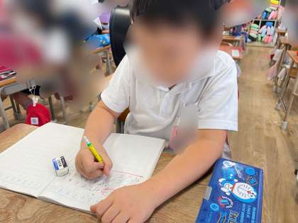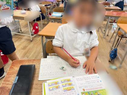 「ふえたりへったり」の学習で、「3+1+4」や「5+3ー2」などの問題作りをしました。足すときは「1個もらいました」、引くときは「2個あげました」など、たし算かひき算かによって、言葉が変わることに気づきました。