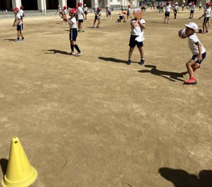 ボール投げでは、コーンを狙って投げたり、キャッチボールをしたりして、ボールに慣れました。