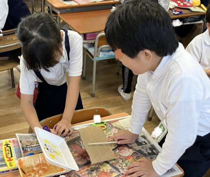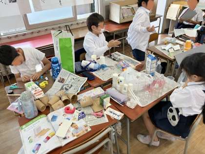 それぞれの家から持ってきた材料でおもちゃを作りました。