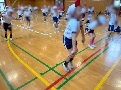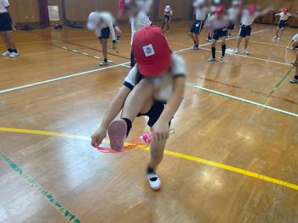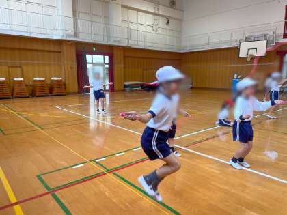 縄を短く持ってくぐったり縄を置いて前や後ろにジャンプしたりしました。前跳びや後ろ跳びにも挑戦しました。脇を閉めて、手首を回すことを意識して跳びました。たくさん練習して、他の跳び方も挑戦する予定です。