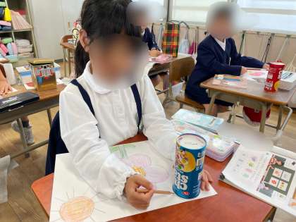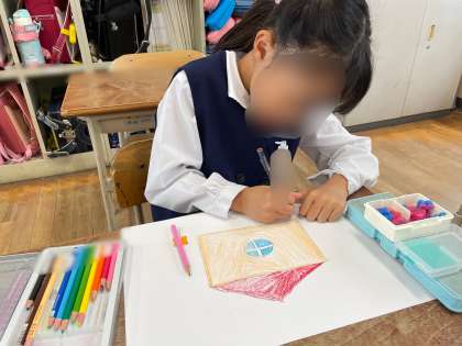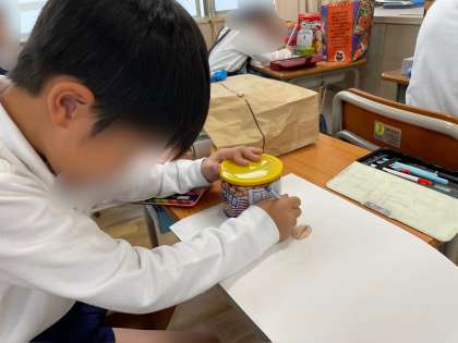 家から持ってきた箱の形を写し取り、絵を描きました。箱をうまく組み合わせて、花やバス、ロボットの絵を描くことができました。