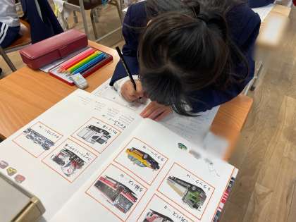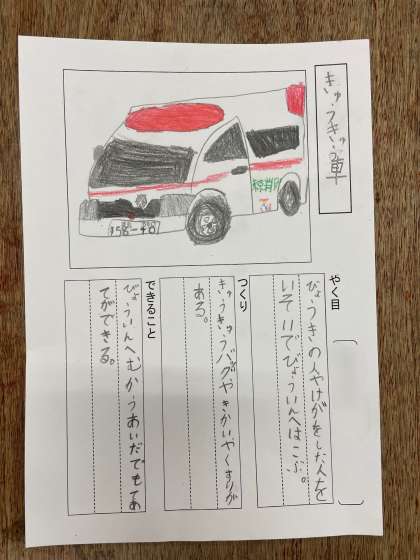 市立図書館で借りた乗り物の本を読み、「のりものカード」を作りました。乗り物の役目、つくり、できることを本から読み取り、カードにまとめました。