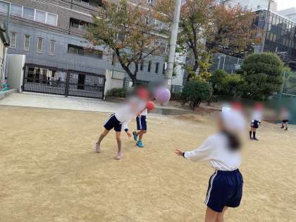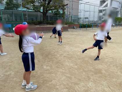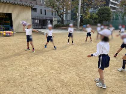2人組になってキャッチボールをしました。上から片手で、投げる方の手と反対の足を出して相手の胸に向かって投げる、受けるときは胸の前で手を構えることを意識しました。少しずつ、狙ったところへ投げられるようになってきました。