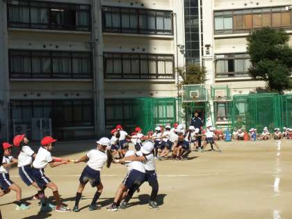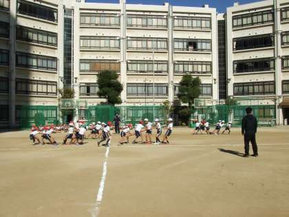 3年生が東中学校の運動場をお借りして、個人走と団体競技「棒引き」の練習をしました。