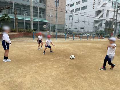 3人で三角形をつくり、鬼役の子にボールを取られないようにパスを回すゲームをしました。ボールを持っている子の名前を呼んだり、目で合図をしたりして上手にパスをつないでいました。