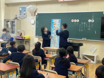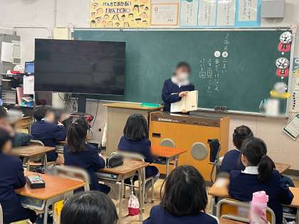 読書期間中の朝は、1・2年生には図書委員による「お話プレゼント」があります。絵本や紙芝居などの読み聞かせを聞き、1・2年生はとても嬉しそうです。
