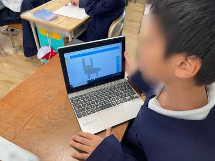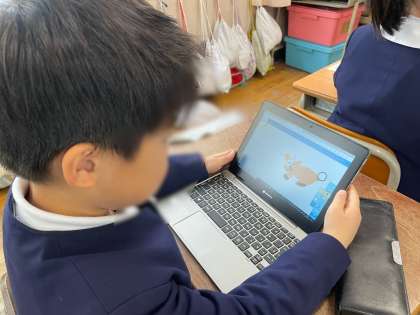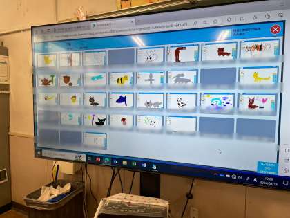 パソコンの発表ノートを使って、動物の絵を描きました。ペンで描いたり図形を組み合わせたりしてかわいい動物がたくさん集まりました。