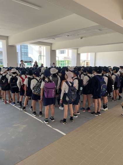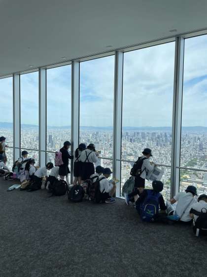 社会見学であべのハルカスに行きました。高い所から大阪市の様子を見て、東西南北によってどんなちがいがあるのかを見つけました。西側に海が広がっている、南側は低い家が多いなどと気がついたことをメモしました。駅や電車、館内のルールを守って、見学することができました。