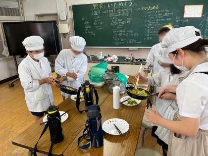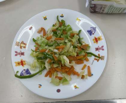 キャベツ、ピーマン、にんじんを切って、フライパンで炒めます。