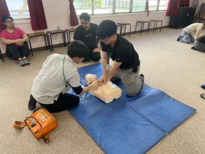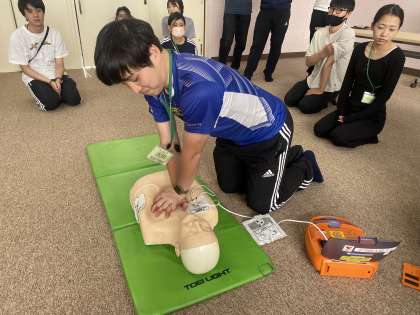 放課後に、救急救命講習を実施しました。心肺蘇生の方法やAEDの使用の仕方について確認した後、ロールプレイングを行いました。