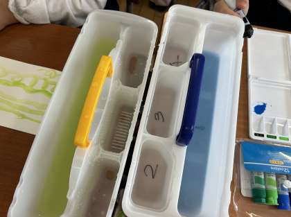 筆を洗うと透明の水が綺麗な色に変身し、みんな大喜び♪