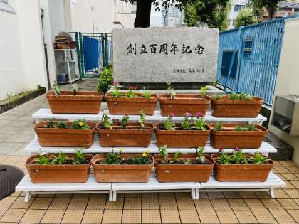 南大江小学校の玄関に苗を植え替えたプランターを置いています。