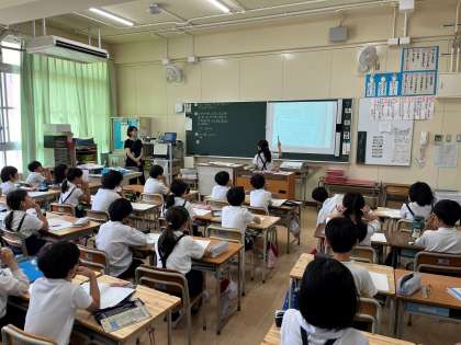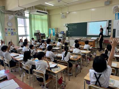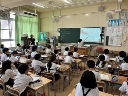 今日、3年1組では算数科「あまりのあるわり算」を学習していました。子どもたちは自分の考えをノートに書き、全員の前でその内容を堂々と説明できていました。この授業は教員同士が互いに参観し、授業技術を磨きあう公開授業にもなっています。子どもたちだけでなく教員も学び続けることがとても大事です。