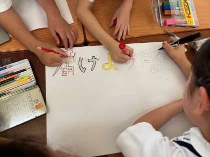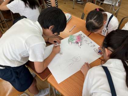 難民支援について学習した後、5年生は各教室に戻りSDGsの取り組みを呼びかけるポスター作成を行いました。関西学院千里国際の先生、また生徒の皆様が総勢20名以上でお越し頂き、一緒に各教室に入ってご指導を頂きました。