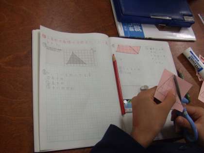 配られた三角形カードを切り、長方形に変形させて考えたり、三角形2つを組み合わせて大きな平行四辺形として考えたりしました。自分の考えをプロジェクタに映して説明する活動場面もありました。