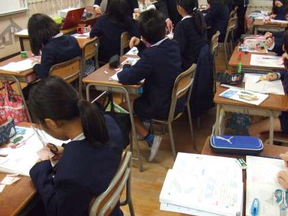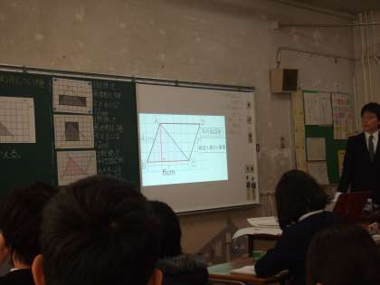 5年1組で算数の授業研究を行いました。「三角形の面積の求め方を既習の図形に帰着して考え、説明する」ことを目標にしました。