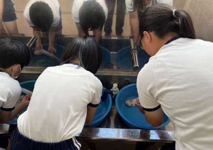6年生は洗濯の仕方について学習し、自分の靴下、タオルを洗いました。