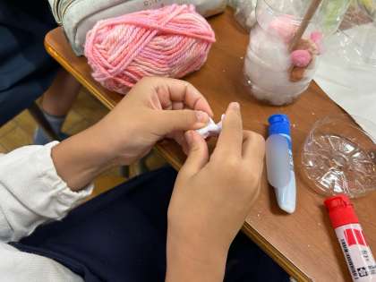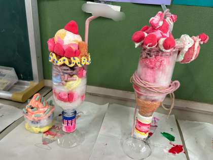 ペットボトルで作った容器にいろんなフルーツやおかしを詰め込み、とても美味しそうなパフェが完成しました。