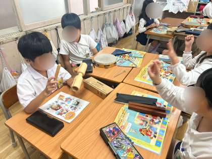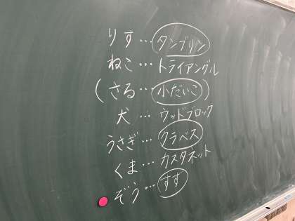 全員が全種類(小だいこ以外)の打楽器に触れた後に曲を聴き、どこの部分でどの打楽器が使われているかを確認しました。