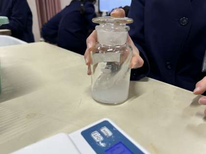 薬さじをつかい、電子てんびんの上で食塩やミョウバンの重さを正確に測りました。誤差の範囲で測るのがむずかしい!