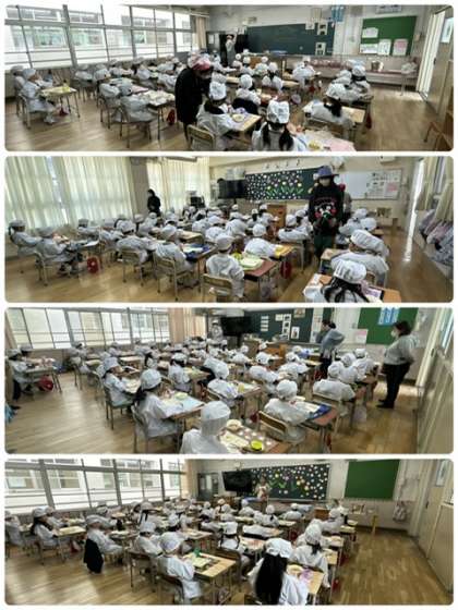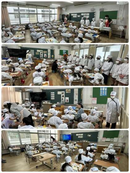 今日もおいしい給食を食べています。6年生がお手伝いとお手本に来てくれました。