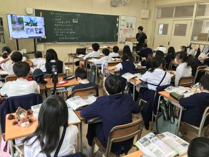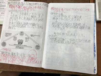 6年生社会では、「平和主義とはどのようなことなのだろう。」について学習していました。戦争や原子爆弾で多くの人が亡くなり、戦後毎年式典が行われているということを調べ、その目的は、戦争の悲惨さ命の尊さを次の世代に伝えるためと自分の言葉で考えノートにまとめていました。