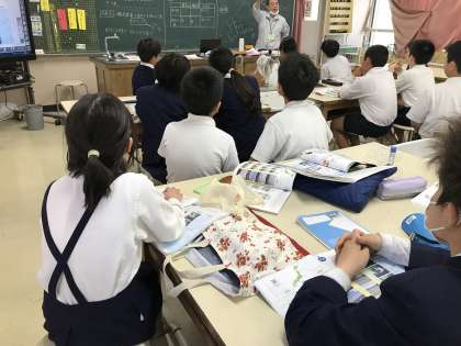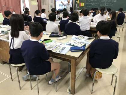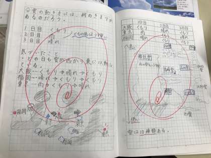 4年生理科では、「雲の動きには何のきまりがあるのだろう。」という学習で、雲の種類を思い出した後、各主要都市での天気図で雲の動きを調べながら学習しました。皆興味深く真剣に聞いていました。