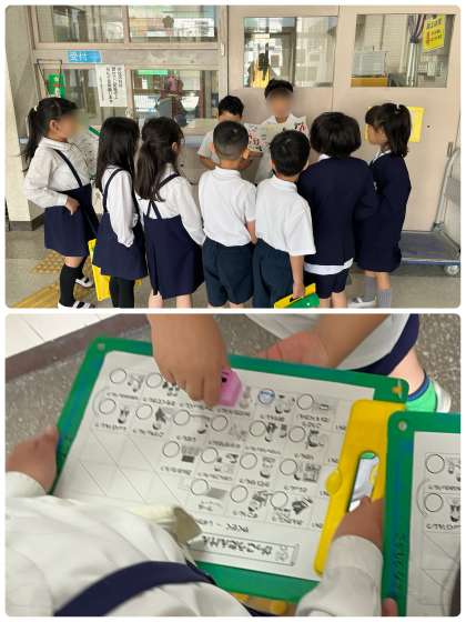 教室の紹介をして、1年生のカードにスタンプを押しました。