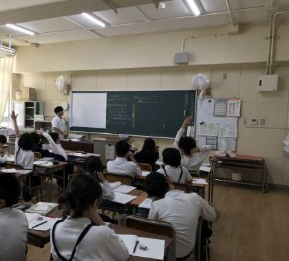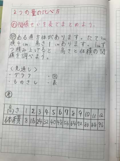 5年算数では、「2つの量の比べ方」の学習でした。表を使って調べる作業の途中、「なんだか野球の点数表に見えてきた」という友達の声に笑い、みんな楽しそうに完成させていました。