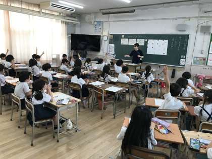 2年生は栄養教諭の竹原先生に、食べ物の働きについて教えてもらいました。エネルギーのもとになる食べ物は黄色、体を作るもとになる物は赤、体の調子を整えるもとになる物は緑のグループに分けて絵に色を塗りました。「好き嫌いなくおいしく食べたい」とみんなしっかり発表し考えていました。