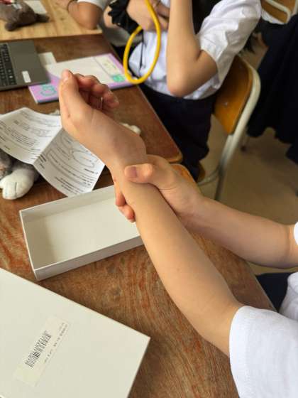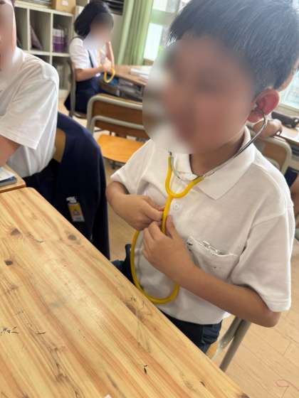 「90回ピッタリや!!」「心臓の音聞こえる!」など道具を大事に扱いながら、自分の心臓の音を静かに聞くことができました。