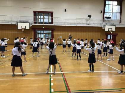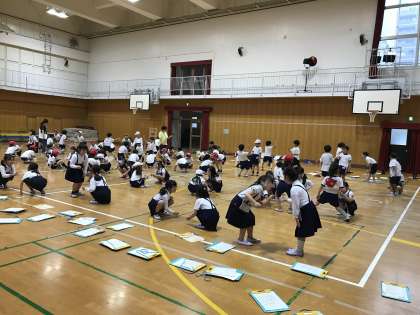 2年生体育では、水泳学習のための整列や準備体操を頑張っていました。「エビカニクス」の音楽に合わせて水中での動きを練習しました。2年生の子どもたちは、水泳学習をわくわくして待っています。