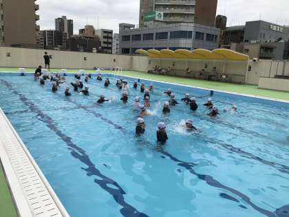 2年生体育ではプールでの水泳授業でした。「エビカニクス」で準備体操をしてから、バディーで一人がお地蔵さんになって水をかけてもらったり、カニのポーズでプールを歩いたり走ったりしました。最後は宝探しをして水に潜ることをとても楽しく学習していました。宝を取れた子どもの表情がとっても嬉しそうで生き生きしていました。