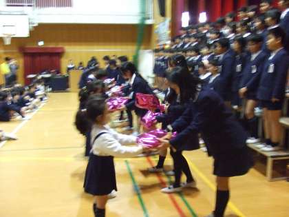 6年生によりる合奏のプレゼントの後には、6年生の手作り(ミシン縫い)の雑巾のプレゼントもありました!