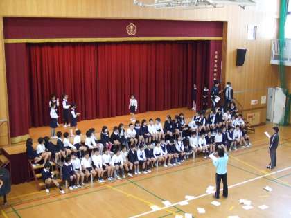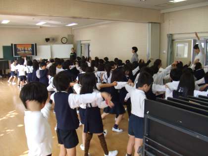 今週より本格的に学芸会の劇の練習が始まりました。24日の本番に向けて、どの学年もがんばっています。(写真上は、3年生の練習風景です。写真下は1年生が劇中で踊るダンスの練習をしているところです)