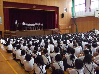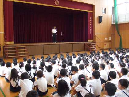 始業式では、校長先生からオリンピックの話題とあわせて「苦手なことにもあきらめず、がんばって取り組んでほしいと思います」との話がありました。その後に5名の転入生の紹介、賞状や水泳記録会の記録証の授与、6年生2名による2学期の抱負の発表などがありました。