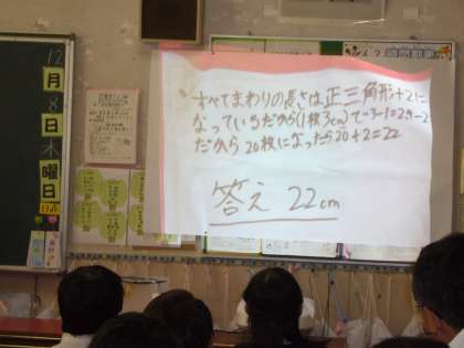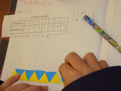 子どもたちは、正三角形の数が20個のときの周りの長さを実際に正三角形を並べてみて調べました。三角形の数を□、周りの長さを○として、□+2=○の式に表し、簡単に周りの長さを求められることが分かりました。