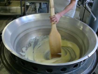 ・給食のシチューは、ルゥから作ります。約1時間ほど小麦粉とサラダ油をじっくり炒めた手作りルゥと、約10種類の調味料を加えて煮込んで仕上げます。