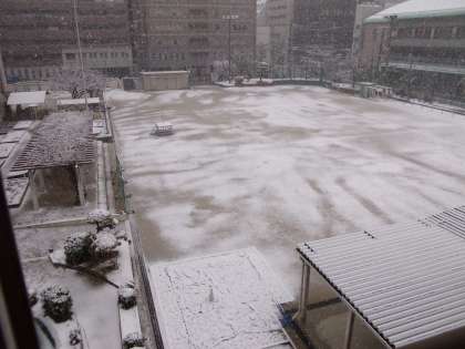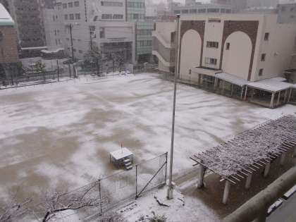 2月14日(金)朝から雪空。大阪ではめずらしく、午前中ずっと雪でした。校庭も雪景色になりました。(写真は午前10時に撮影)