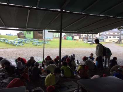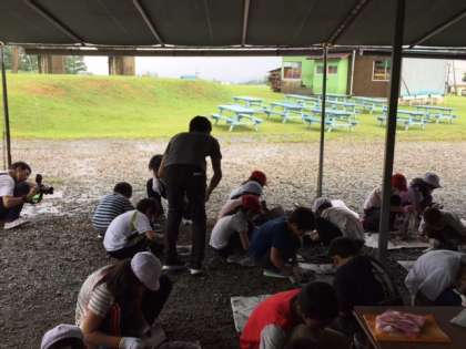 雨は依然降り続いていますので、飯ごう炊さん場で焼き板作りに取り組んでいます。炭の付いた板がみがかれることで、美しい木目が出てきました。これから色付けをします。