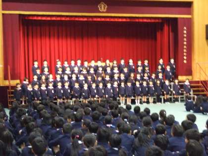 本日は、講堂で修了式を行いました。校歌をうたったり、学年代表児童が校長先生から修了証を受け取ったりしました。校長先生からは、「計算や漢字、健康、友達と仲良くしたことなど、一人ひとりがんばったところは違うと思います。一人ひとりのがんばりは、南大江小学校全体のがんばりになりました。」との話がありました。