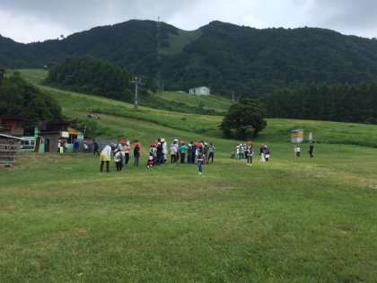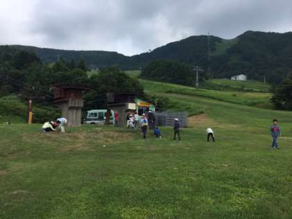 昼食までの時間、高原遊びを楽しんでいます。鬼ごっこをしたり、バッタを観察したり、夏の高原を満喫しています。