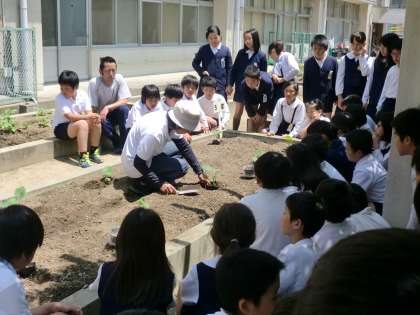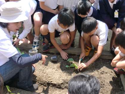 ・辰巳さんが、大切に育ててくださった勝間南瓜の苗を、5年生のみなさんが定植しました。