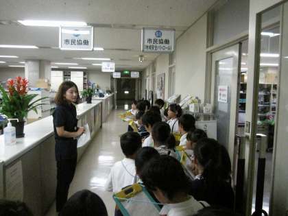 3年生の社会科の学習で、中央区役所・区民センターへ行きました。区役所の各階の仕事内容を見学しました。区民センターでは舞台の上で、音響や照明の体験をしました。また、マスコットキャラクターの「ゆめまるくん」にも会うことができ、子どもたちは楽しく学習することができました。