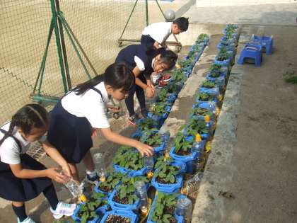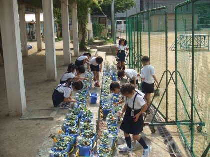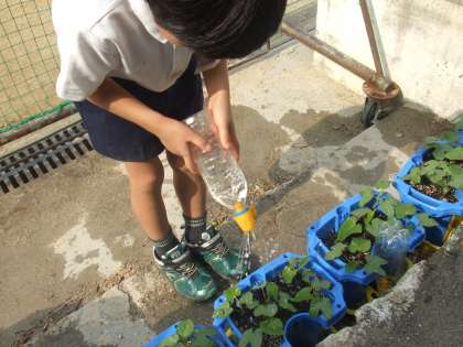 1年生が大切に育てているアサガオがすくすく育っています。本葉が大きくなってきました。毎朝の水やりをしっかりしています!