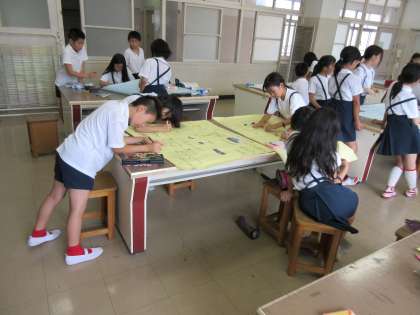4年生が総合的な学習の時間で、世界の国々について調べてきました。サッカーブラジルW杯の出場国について、グループに分かれ、調べたことを模造紙にまとめました。学校の様子や言語、食べ物、建築物など、班で協力して丁寧に調べました。