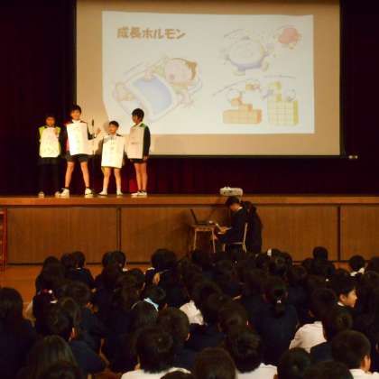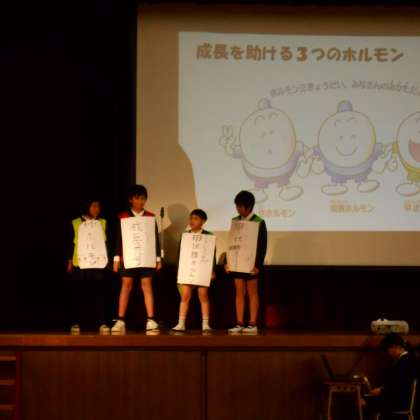 17日、学校保健委員会をおこないました。健康委員会が「どうして眠らなければいけないのか」についての発表をおこないました。眠ることで成長を助ける3つのホルモンが分泌され、骨や筋肉をのばしたり、細胞の数を増やして体を大きくしたり、おとなの体に近づける役割をしていることを発表しました。校医の先生からも、「小学生は遅くとも10時までに寝る必要があります。寝る前にスマートフォンなどのブルーライトを受けると、眠りにくくなります。」とお話がありました。