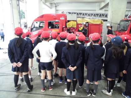 2クラスずつ分かれて見学をさせて頂きました。消防車や放水ホース、隊員が着る防火服を実際に触らせて頂きました。講堂では大阪市の消防についての動画を見せて頂き、質問コーナーでたくさん話を聞かせて頂きました。